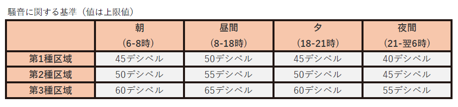 さらに注意すべきは時間帯です。早朝(6時から8時)や夜間は基準値がさらに5〜10デシベル引き下げられます。